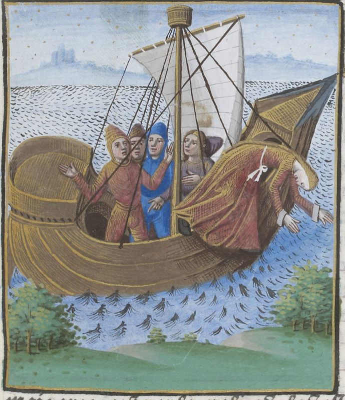 Parigi, Bibliothèque Nationale de France, Vélins 1223, f. i7r. Incunabolo miniato stampato a Parigi da Antoine Vérard il 26/04/1493. Ippona si getta in mare dalla nave per sfuggire…
