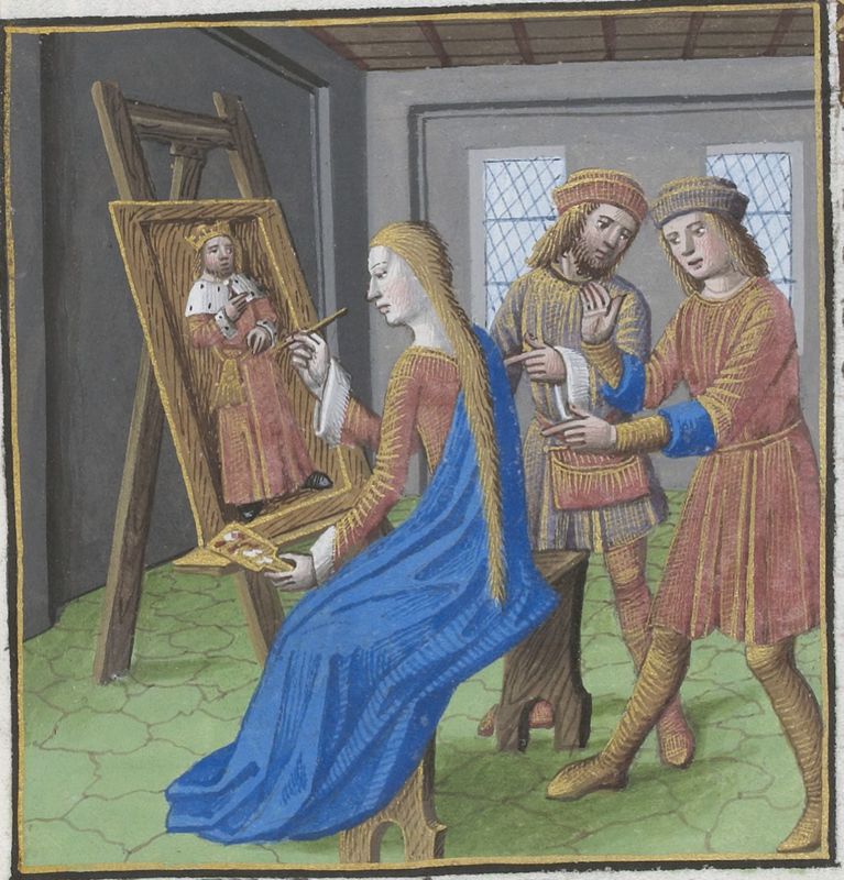 Parigi, Bibliothèque Nationale de France, Vélins 1223, f. l1v. Incunabolo miniato stampato a Parigi da Antoine Vérard il 26/04/1493. Irene dipinge il ritratto di una giovane.