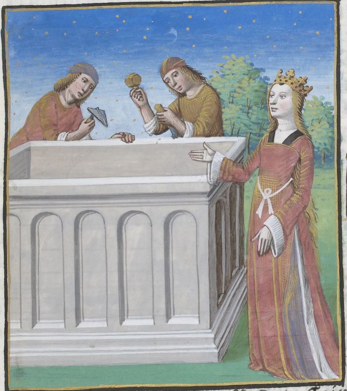 Parigi, Bibliothèque Nationale de France, Vélins 1223, f. n1v. Incunabolo miniato stampato a Parigi da Antoine Vérard il 26/04/1493. Dripertua, figlia di Mitridate, siede alla tavo…