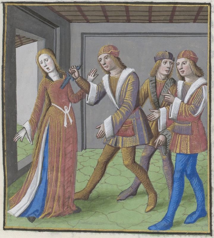 Parigi, Bibliothèque Nationale de France, Vélins 1223, f. n2r. Incunabolo miniato stampato a Parigi da Antoine Vérard il 26/04/1493. Sempronia rifiuta di riconoscere il nipote dina…