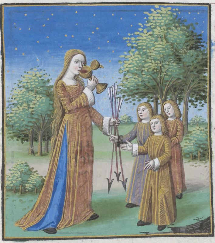 Parigi, Bibliothèque Nationale de France, Vélins 1223, f. l6r. Incunabolo miniato stampato a Parigi da Antoine Vérard il 26/04/1493. Flora corteggiata da tre uomini.