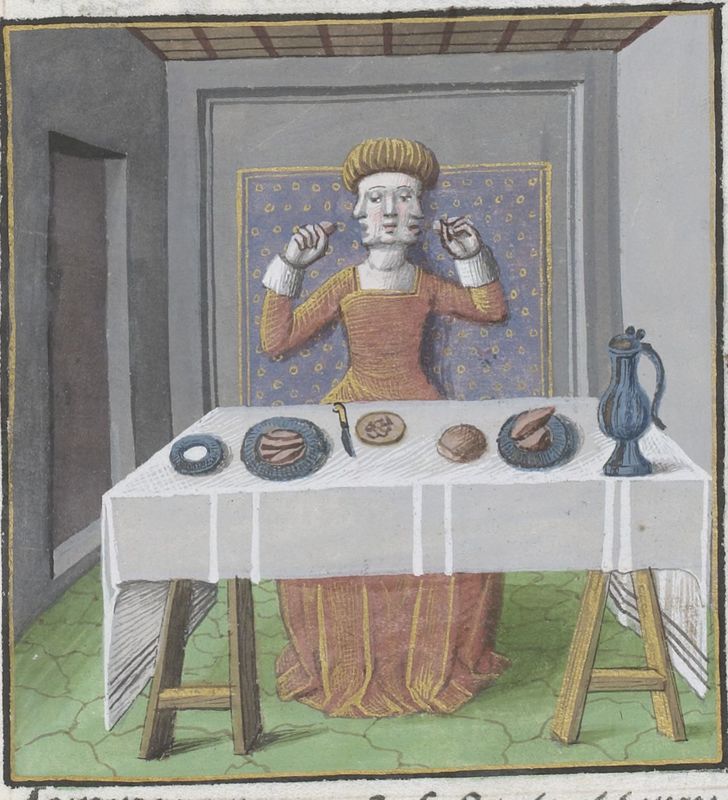 Maestro di Jacques de Besançon (1493), Dripertua siede alla tavola imbandita