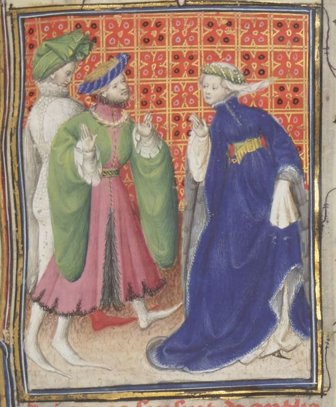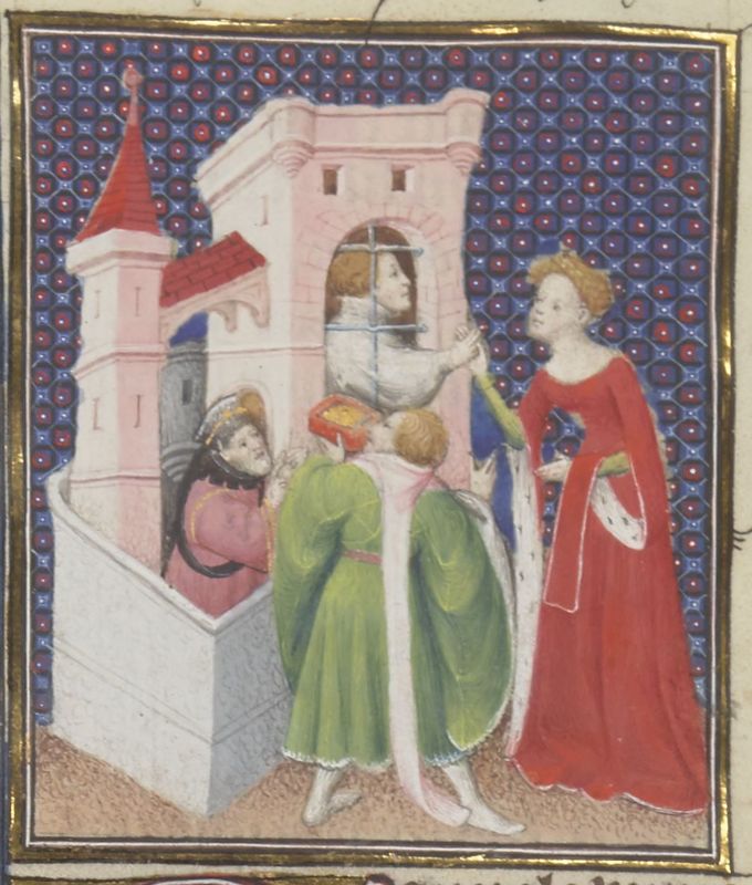 Parigi, Bibliothèque Nationale de France, Fr. 12420, f. 161r. Camiola fornisce il denaro per pagare il riscatto del principe Rolando in cambio di una promessa di matrimonio.