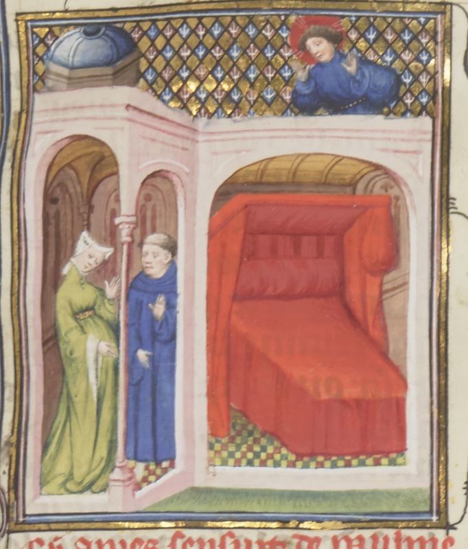 Parigi, Bibliothèque Nationale de France, Fr. 12420, f. 124r. Curia nasconde il marito in soffitta con l'aiuto di una schiava.