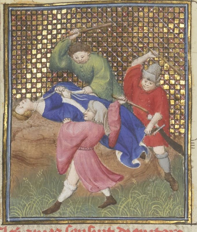 Parigi, Bibliothèque Nationale de France, Fr. 12420, f. 137v. Agrippina viene bastonata a morte per ordine del figlio Nerone.