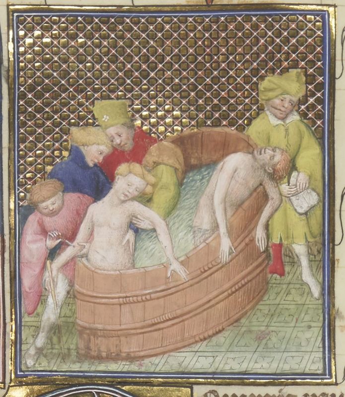 Parigi, Bibliothèque Nationale de France, Fr. 12420, f. 142r. Pompea Paolina si taglia le vene nella vasca da bagno insieme al marito Seneca, aiutata da tre servitori.