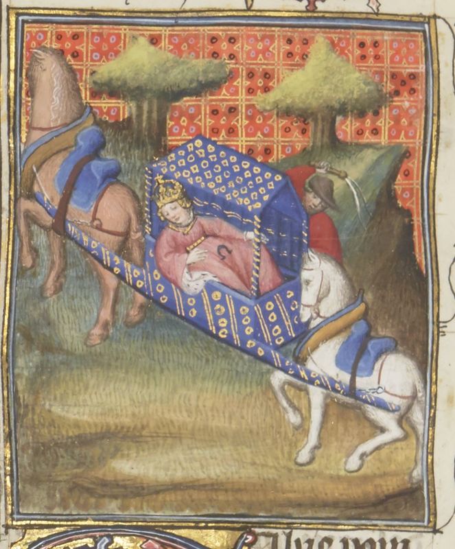 Parigi, Bibliothèque Nationale de France, Fr. 12420, f. 143v. Poppea Sabina, moglie di Nerone, viene portata via in lettiga (sul suo ventre è disegnato un ferro di cavallo, forse i…
