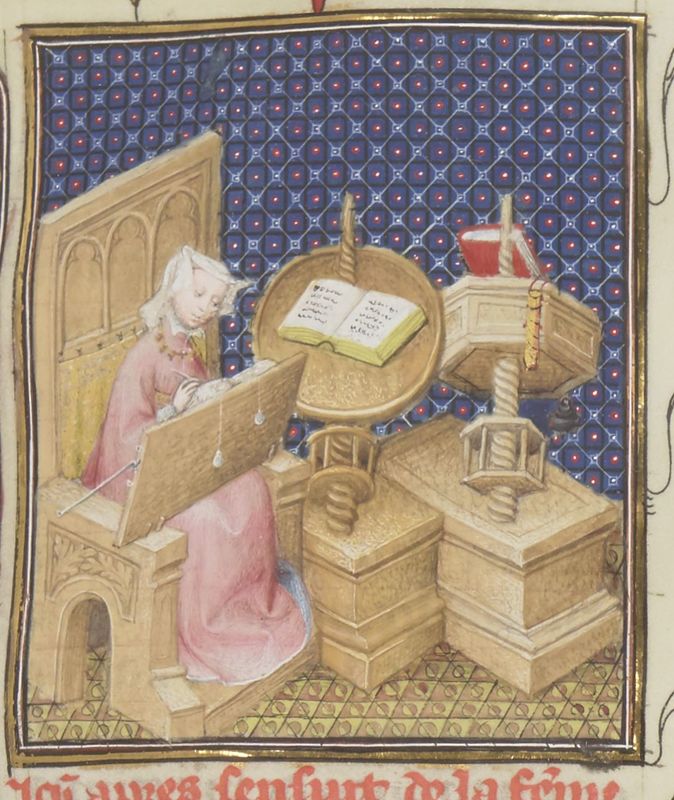 Parigi, Bibliothèque Nationale de France, Fr. 12420, f. 127r. La poetessa Cornificia sfoglia un libro seduta ad un leggio.