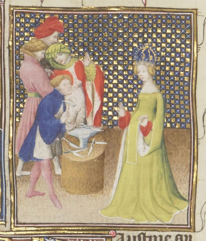 Parigi, Bibliothèque Nationale de France, Fr. 12420, f. 148v. Faustina viene ammirata per la sua bellezza e un uomo prepara gli strumenti per scolpire un suo ritratto.