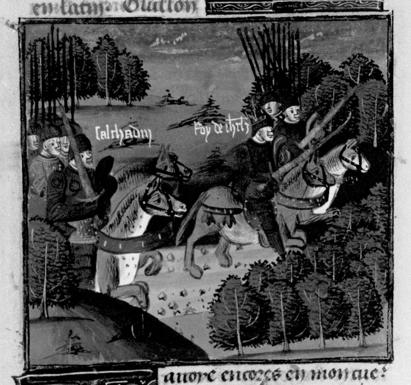 Parigi, Bibliothèque Nationale de France, Fr. 130, f. 190v. Antioco viene ucciso nel bosco dai banditi; Seleuco cade da cavallo.