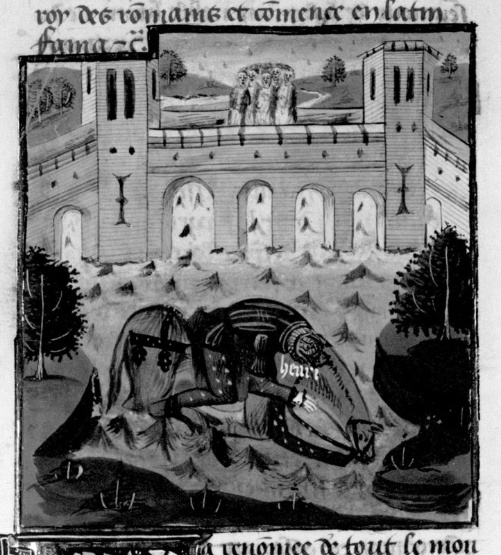 Miniatore francese (1450-1475), Arrigo precipita da un ponte con il suo cavallo