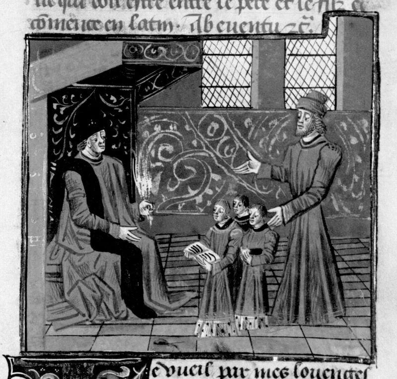 Parigi, Bibliothèque Nationale de France, Fr. 230, f. 260r. Il copista del manoscritto è P. Droulin. Giovanni Boccaccio illustra le virtù dell'amore paterno ad un padre con i suoi …