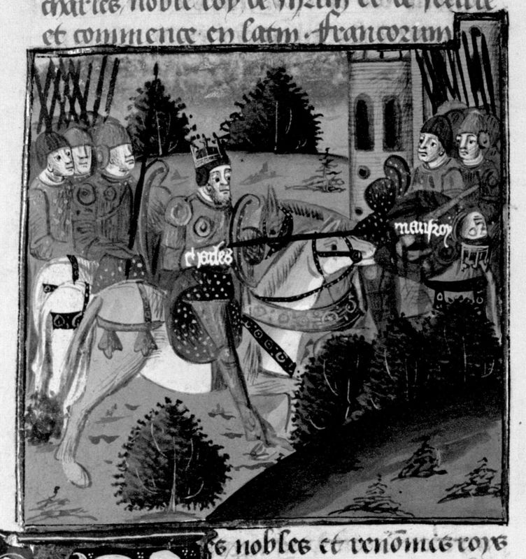 Parigi, Bibliothèque Nationale de France, Fr. 230, f. 261v. Il copista del manoscritto è P. Droulin. Carlo I d'Angiò uccide Manfredi nella battaglia di Benevento.