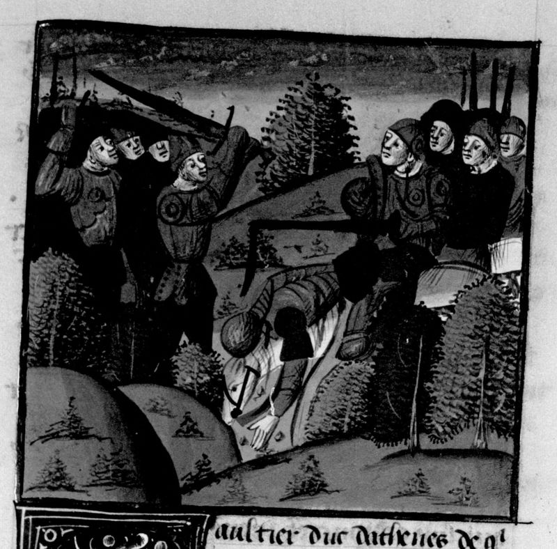 Parigi, Bibliothèque Nationale de France, Fr. 230, f. 268r. Il copista del manoscritto è P. Droulin. Gualtieri di Brienne, duca d'Atene, viene ucciso nella battaglia di Poitiers.