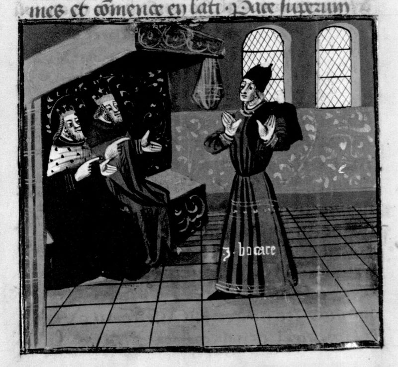 Parigi, Bibliothèque Nationale de France, Fr. 230, f. 270v. Il copista del manoscritto è P. Droulin. Giovanni Boccaccio si trova dinanzi a due sovrani.