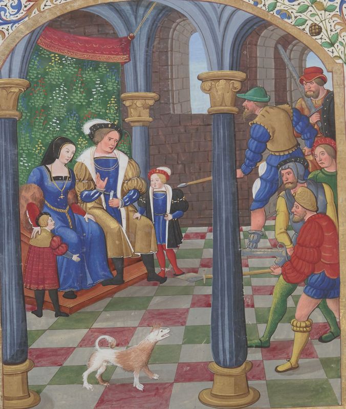 Parigi, Bibliothèque Nationale de France, Fr. 130, f. 356v. L'imperatore Maurizio e la sua famiglia vengono raggiunti dagli assassini inviati dal centurione Foca.