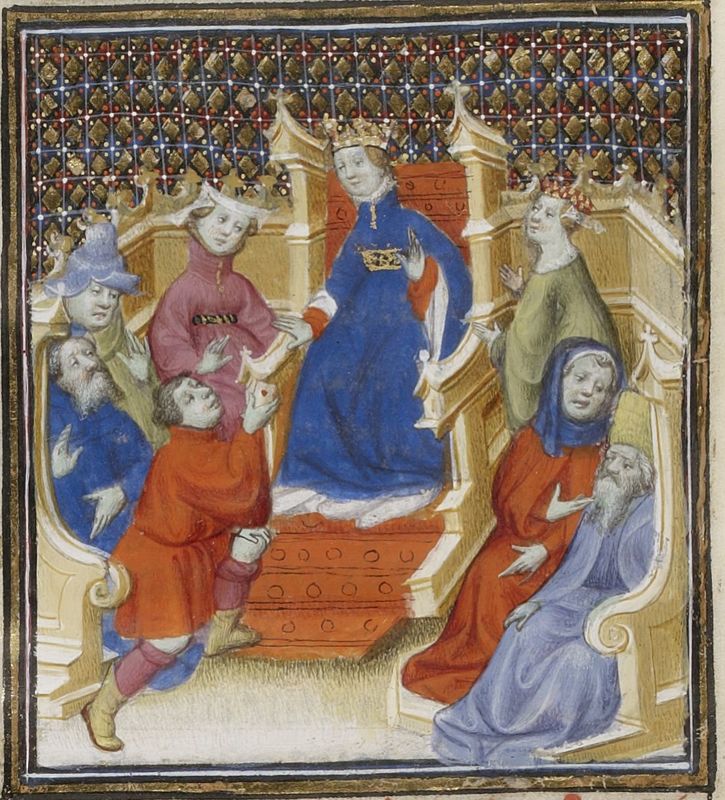 Parigi, Bibliothèque Nationale de France, Fr. 598, f. 159r. La regina Giovanna I, seduta in trono, riceve l'omaggio dei suoi sudditi.