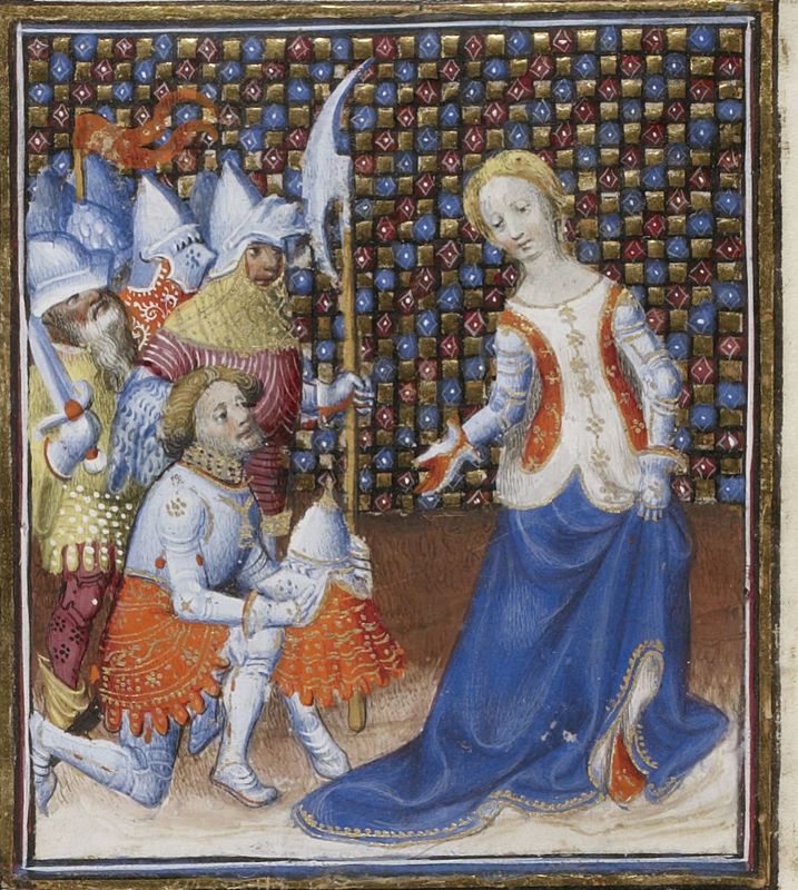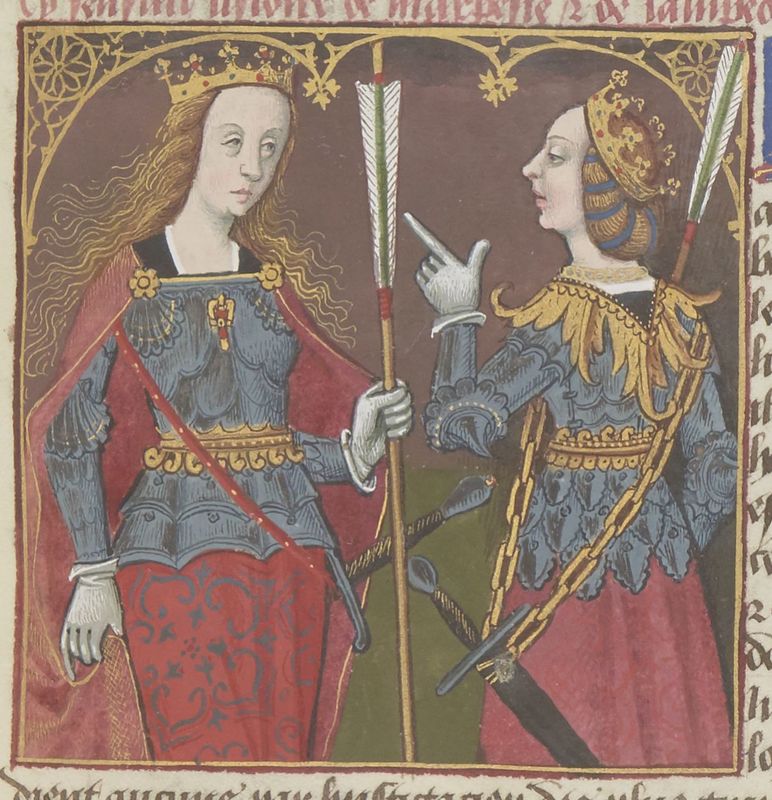 Parigi, Bibliothèque Nationale de France, Fr. 599, f. 12r. Il copista del manoscritto è Johannes Michel. Marpesia e Lampedone, regine delle Amazzoni, con armature, spade e frecce.