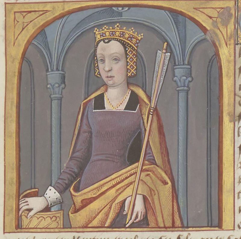 Parigi, Bibliothèque Nationale de France, Fr. 599, f. 5v. Il copista del manoscritto è Johannes Michel. La regina Semiramide con una lunga freccia in mano e un levriero al fianco.