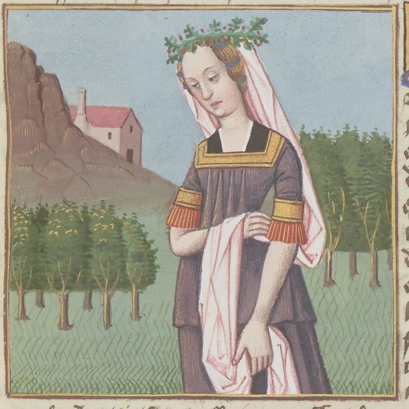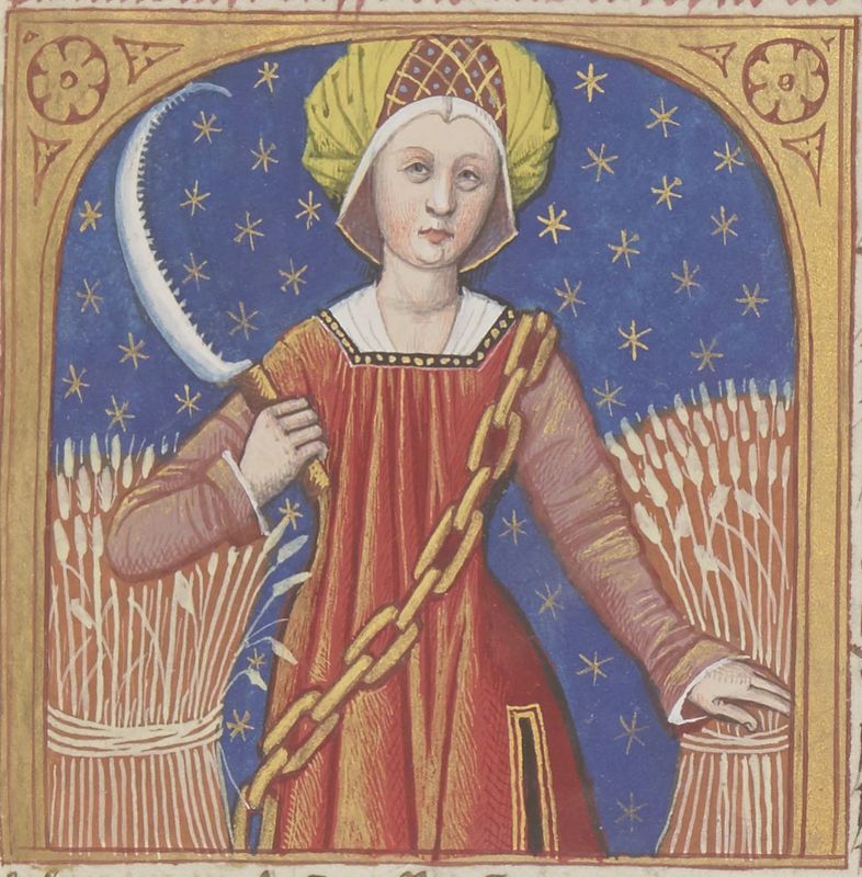 Parigi, Bibliothèque Nationale de France, Fr. 599, f. 8r. Il copista del manoscritto è Johannes Michel. La dea Cerere con una falce in mano, circondata dalle messi.