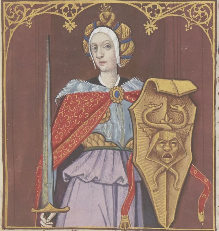 Parigi, Bibliothèque Nationale de France, Fr. 599, f. 9r. Il copista del manoscritto è Johannes Michel. La dea Minerva con la spada e lo scudo su cui è effigiata la testa della Gor…