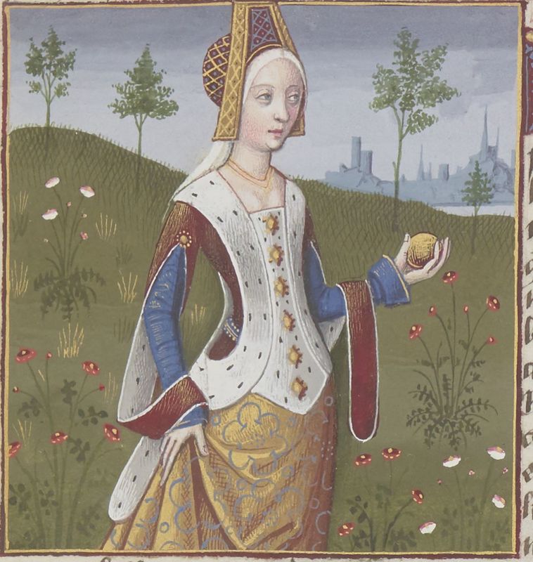 Parigi, Bibliothèque Nationale de France, Fr. 599, f. 10r. Il copista del manoscritto è Johannes Michel. La dea Venere con una mela dorata in mano.