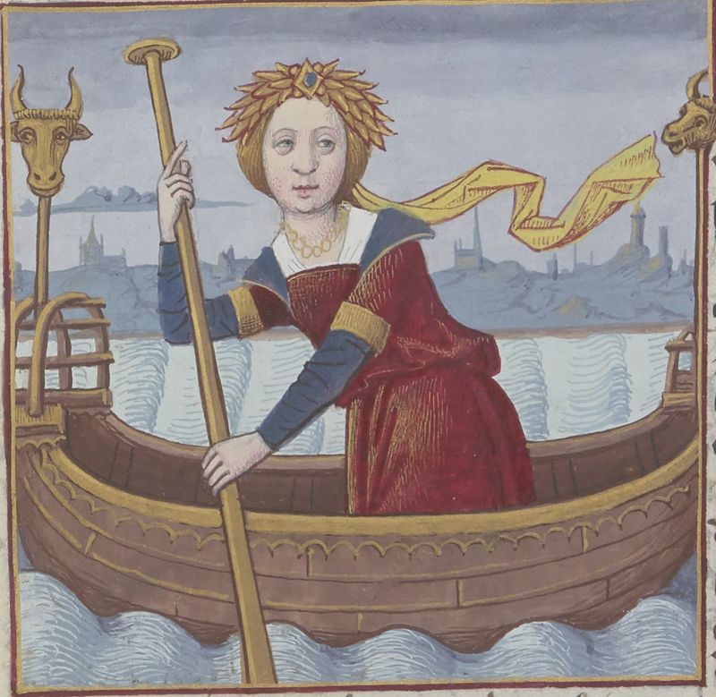 Parigi, Bibliothèque Nationale de France, Fr. 599, f. 10v. Il copista del manoscritto è Johannes Michel. La dea Iside naviga verso l'Egitto.