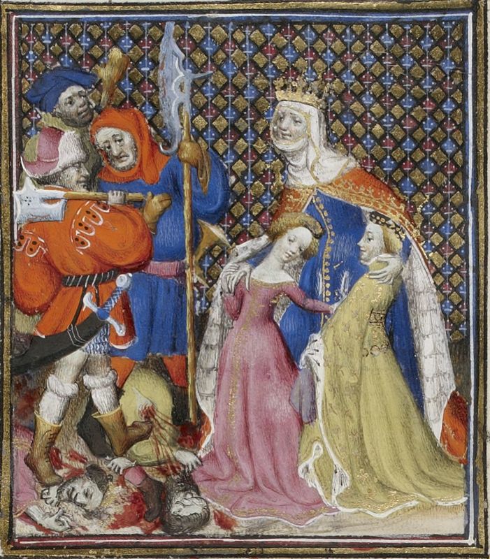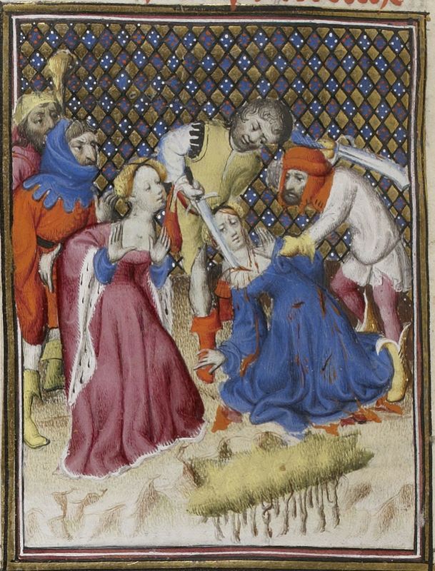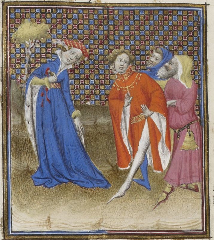 Parigi, Bibliothèque Nationale de France, Fr. 598, f. 102v. Armonia assiste all'uccisione della giovane schiava che ha preso il suo posto da parte di due sicari.
