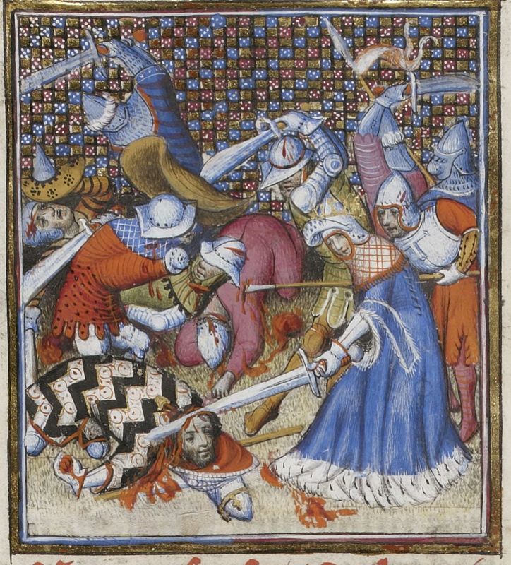 Parigi, Bibliothèque Nationale de France, Fr. 598, f. 74v. La regina Tamiri decapita il cadavere di Ciro, mentre intorno infuria la battaglia.