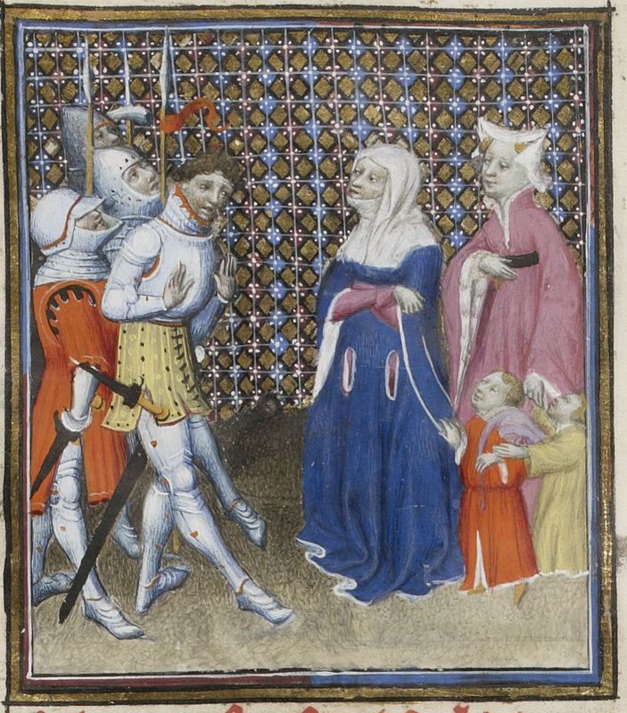 Parigi, Bibliothèque Nationale de France, Fr. 598, f. 83v. Veturia, accompagnata dalla nuora Volumnia con i due giovani nipoti, dissuade il figlio Coriolano dal distruggere Roma.