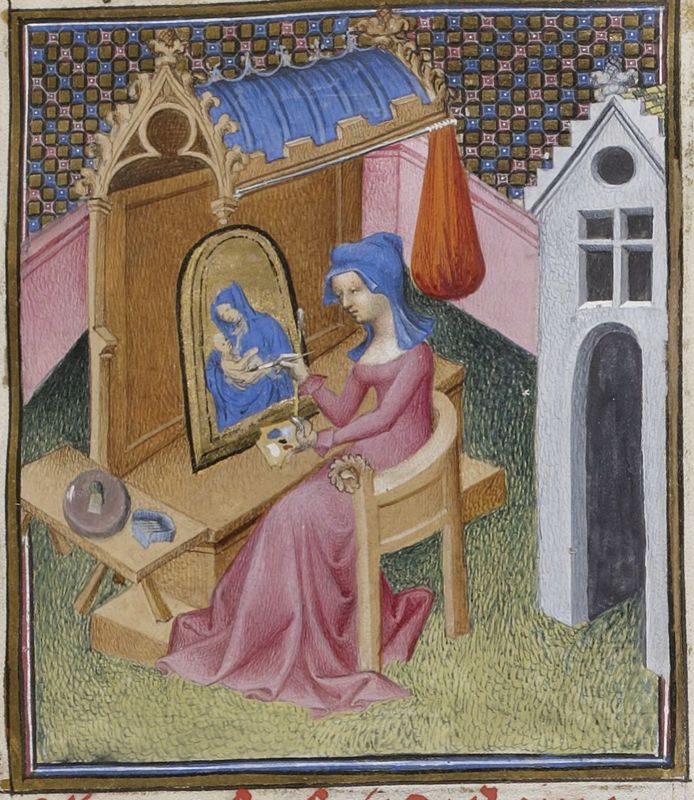 Parigi, Bibliothèque Nationale de France, Fr. 598, f. 100v. Marzia dipinge il proprio autoritratto dinanzi allo specchio.