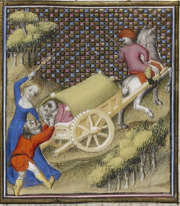 Parigi, Bibliothèque Nationale de France, Fr. 598, f. 95r. Claudia impedisce che suo padre venga gettato giù dal carro trionfale.