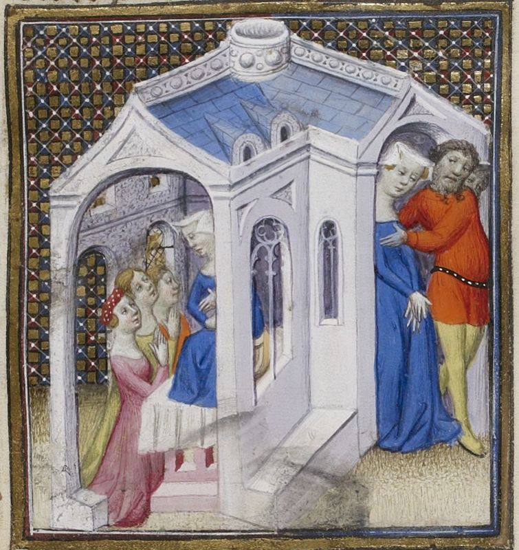 Maestro delle Clères Femmes e collaboratore (1403 c.), Virginia si rivolge a tre devote nel tempio della Pudicizia; Virginia viene espulsa dal tempio