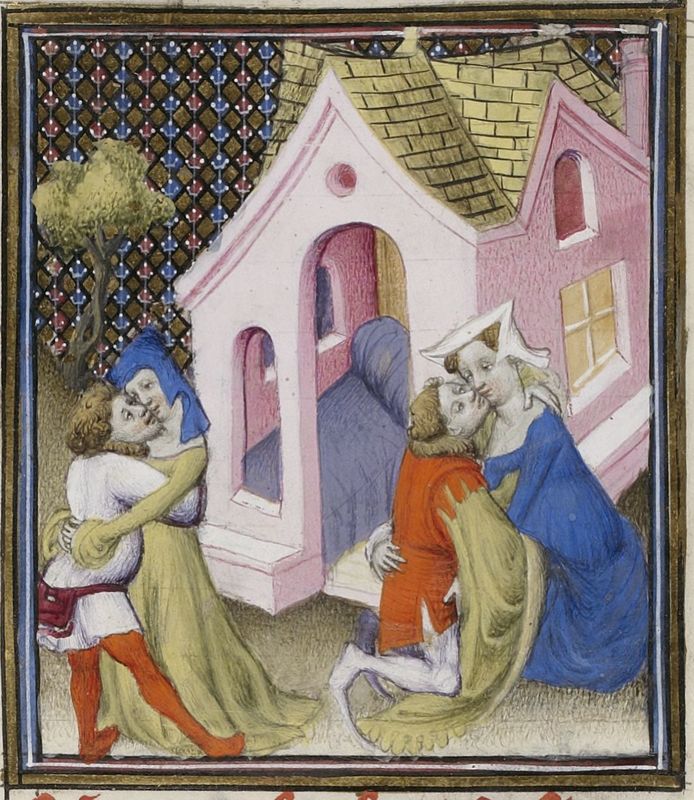 Parigi, Bibliothèque Nationale de France, Fr. 598, f. 97r. Due coppie di giovani si baciano e si abbracciano all'esterno di un'abitazione (celebrazione delle Floralie?).