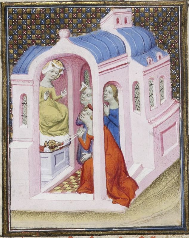 Parigi, Bibliothèque Nationale de France, Fr. 598, f. 101v. Sulpicia consacra con l'incenso la nuova statua nel tempio di Venere.
