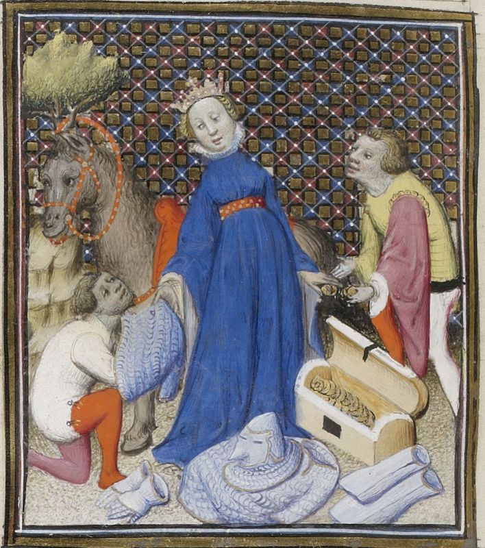 Parigi, Bibliothèque Nationale de France, Fr. 598, f. 82v. Megulia Dotata riceve dal padre una ricca dote per il matrimonio.