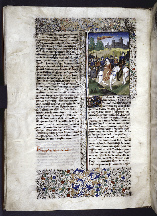 New York, Public Library, Spencer 33, f. 45v. Dripertua cavalca all'amazzone scortata da soldati e nobili in armatura.