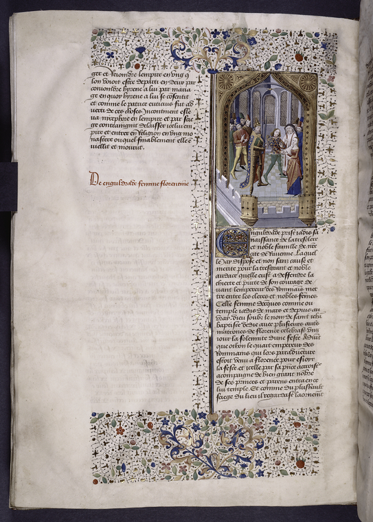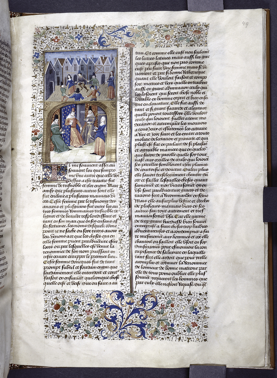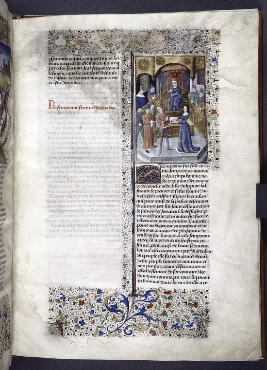 New York, Public Library, Spencer 33, f. 46r. Sempronia si difende contro Equizio dinanzi al magistrato romano.