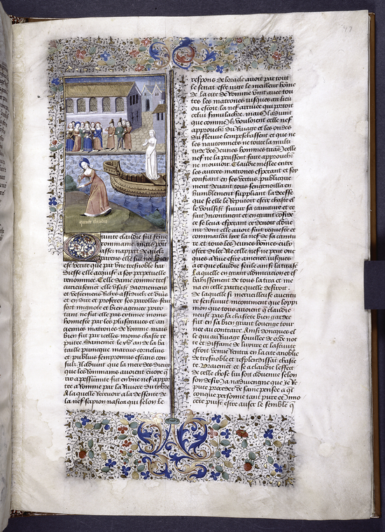 New York, Public Library, Spencer 33, f. 47r. Claudia Quinta dalla riva del fiume traina con la propria cintura la barca su cui viaggia la statua della Magna Mater; dalla riva oppo…