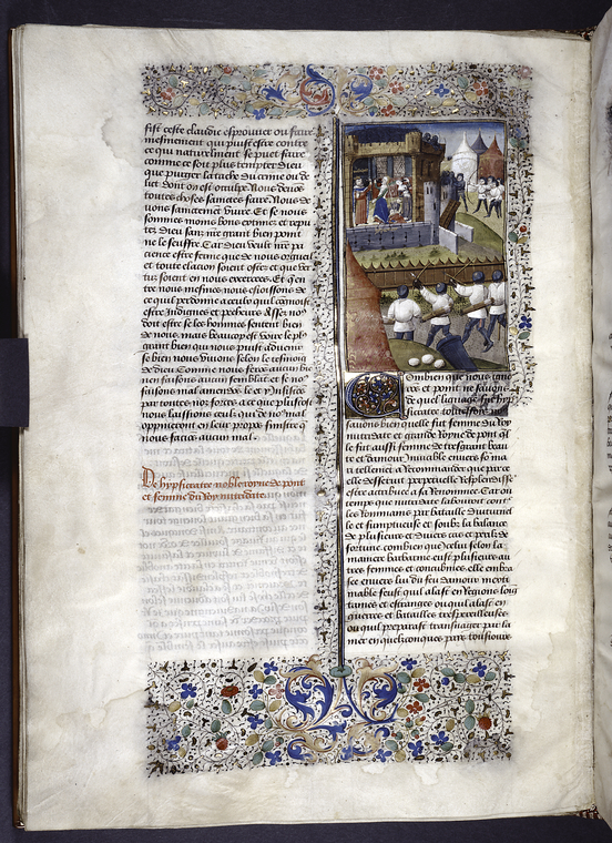 New York, Public Library, Spencer 33, f. 63v. Triaria partecipa a cavallo alla cruenta battaglia all'interno della città.