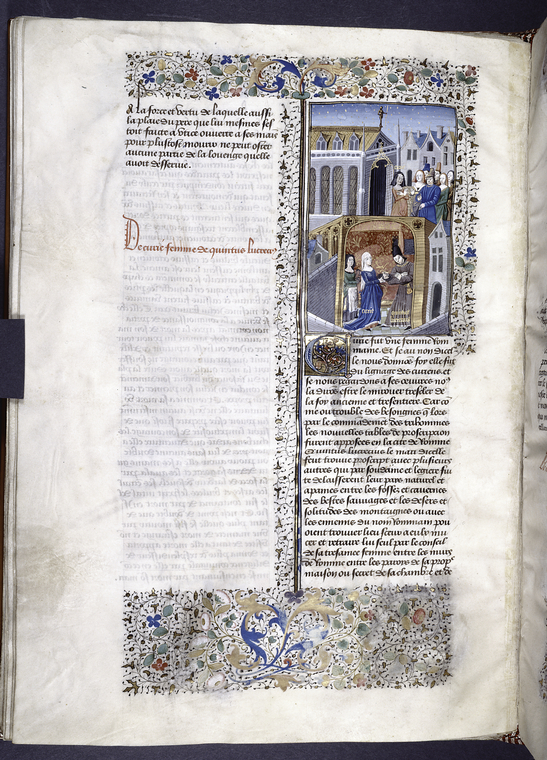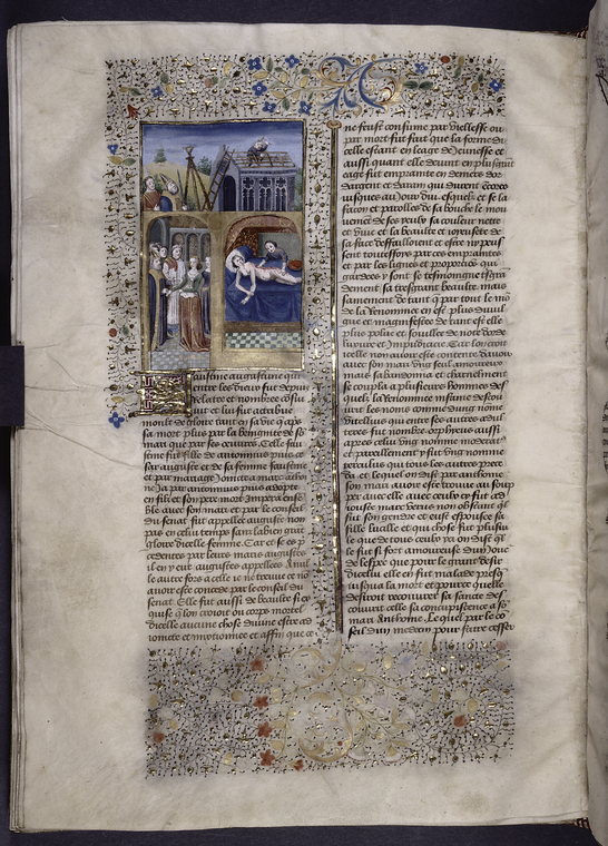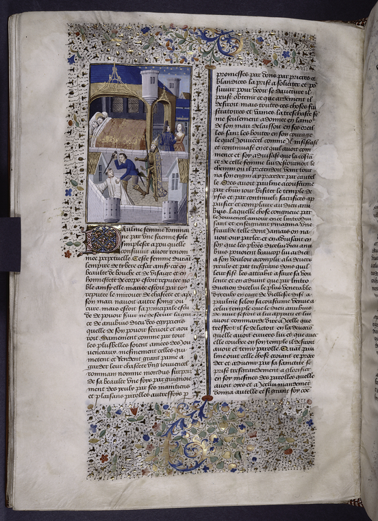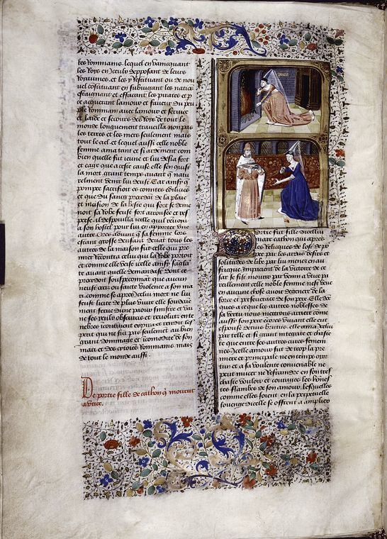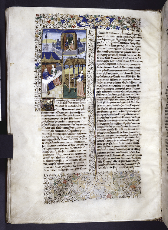 New York, Public Library, Spencer 33, f. 51v. Curia nasconde il marito Quinto Lucrezio in una stanza con l'aiuto di una schiava; Curia si finge addolorata per la morte del marito c…