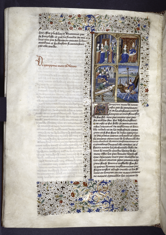 New York, Public Library, Spencer 33, f. 58v. Agrippina sposa l'imperatore Claudio; Agrippina siede sul trono accanto al figlio Nerone; Agrippina viene salvata dall'annegamento da …