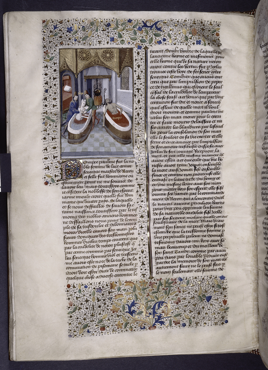 New York, Public Library, Spencer 33, f. 61r. Pompea Paolina si taglia le vene nella vasca da bagno aiutata da due servitori, per suicidarsi insieme al marito Seneca.