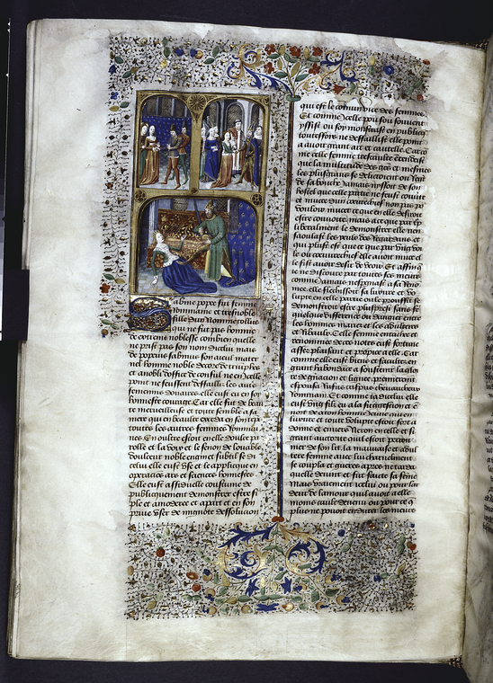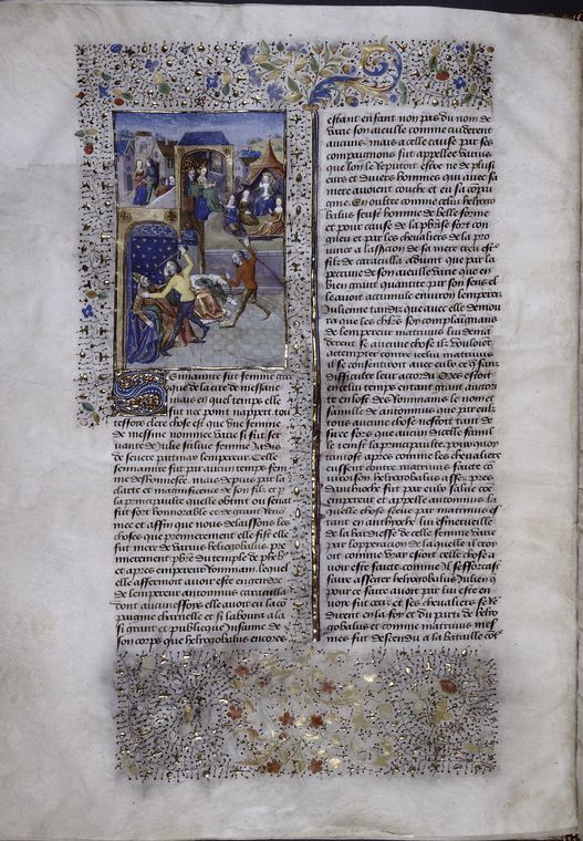 New York, Public Library, Spencer 33, f. 66v. Semiamira si prostituisce; Semiamira appare in Senato al fianco del figlio, l'imperatore Antonio (Eliogabalo); Semiamira presiede il s…