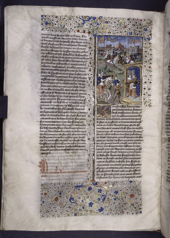 New York, Public Library, Spencer 33, f. 67v. Zenobia viene portata prigioniera dinanzi all'imperatore durante il trionfo; sullo sfondo, guerrieri romani e palmiri si danno battagl…