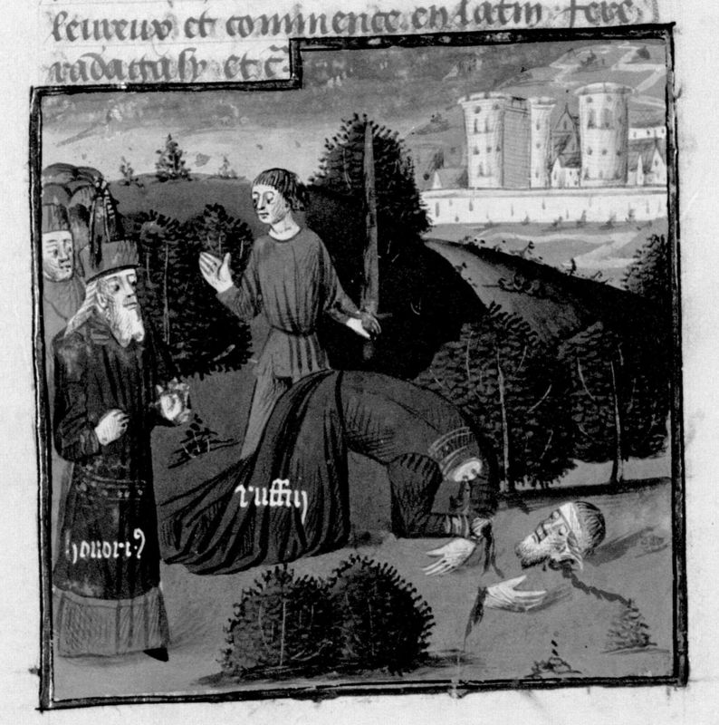 Parigi, Bibliothèque Nationale de France, Fr. 230, f. 231v. Il copista del manoscritto è P. Droulin. Rufino viene decapitato per ordine di Stilicone.