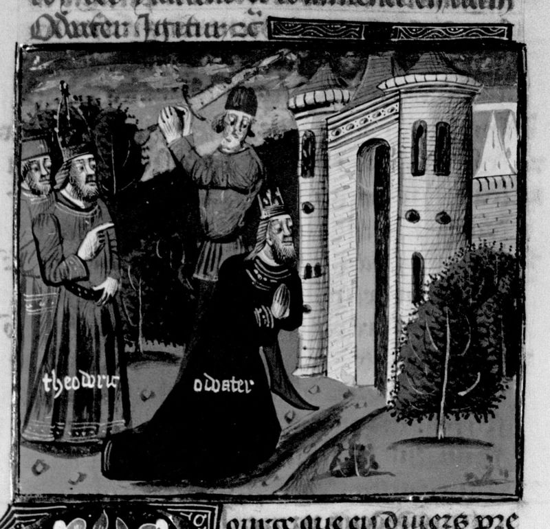 Parigi, Bibliothèque Nationale de France, Fr. 230, f. 233r. Il copista del manoscritto è P. Droulin. Teodorico fa giustiziare Odoacre.
