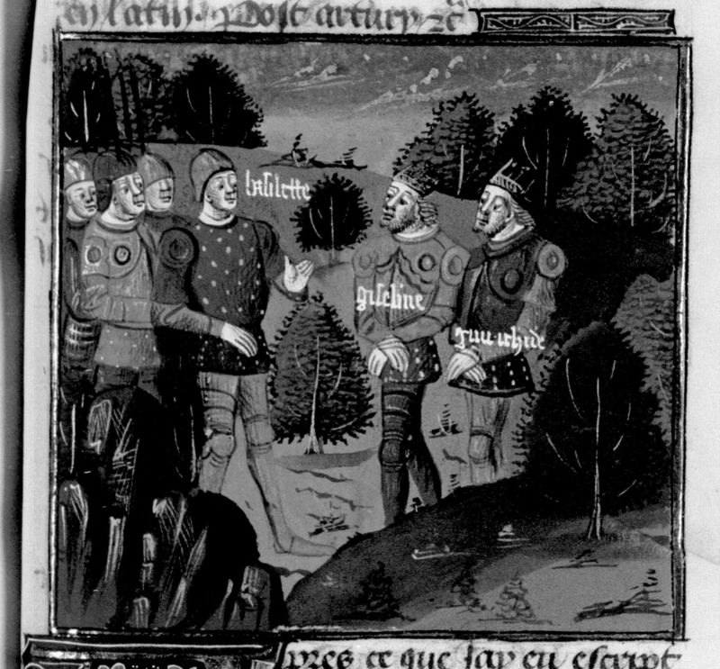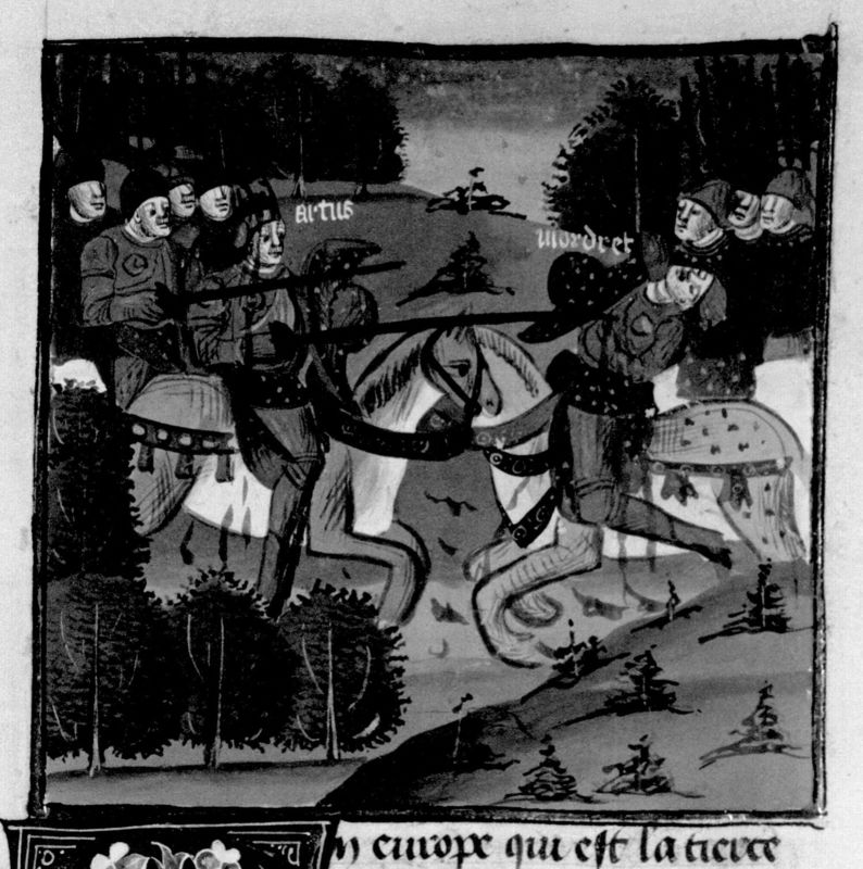 Parigi, Bibliothèque Nationale de France, Fr. 230, f. 236r. Il copista del manoscritto è P. Droulin. Re Artù uccide Mordred in battaglia.