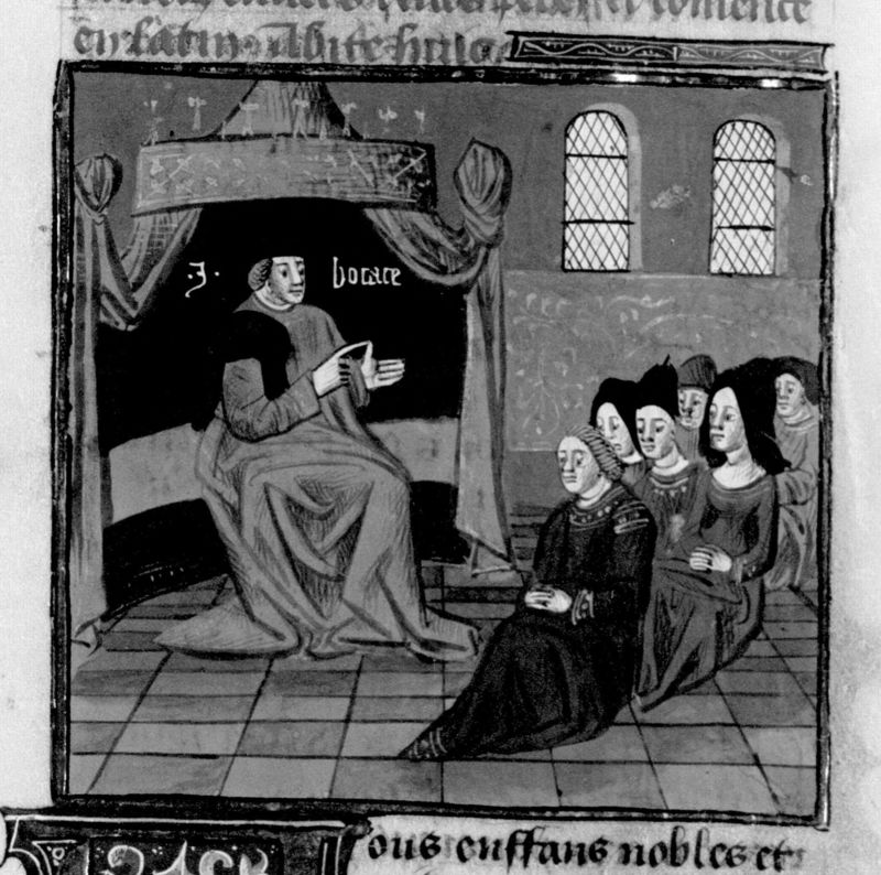 Parigi, Bibliothèque Nationale de France, Fr. 230, f. 241r. Il copista del manoscritto è P. Droulin. Giovanni Boccaccio incontra alcune donne.