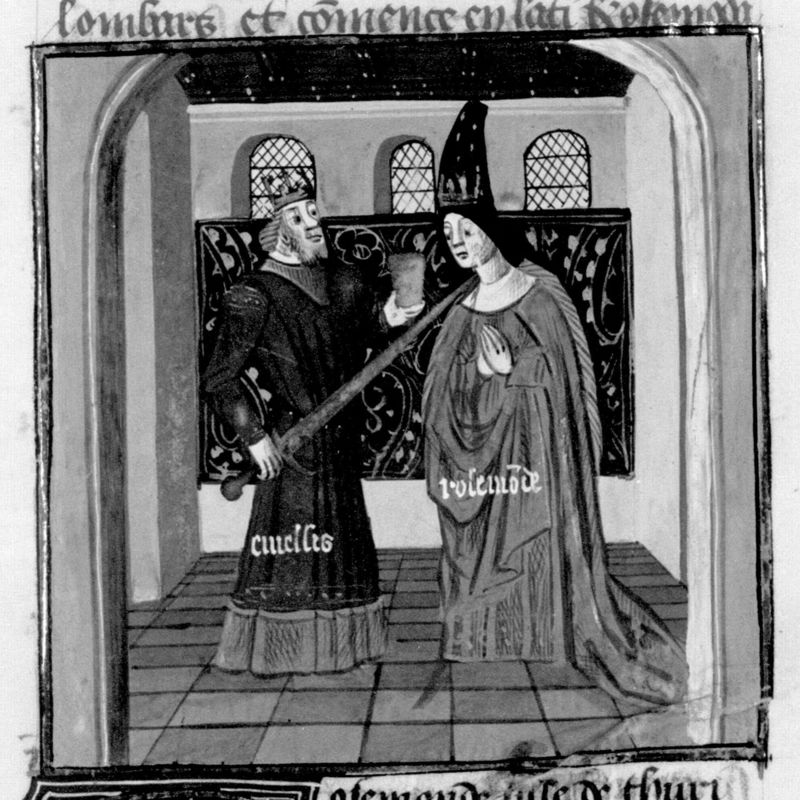 Parigi, Bibliothèque Nationale de France, Fr. 230, f. 239v. Il copista del manoscritto è P. Droulin. Lo scudiero Elmichi, armato di spada, offre una coppa di veleno alla regina Ros…